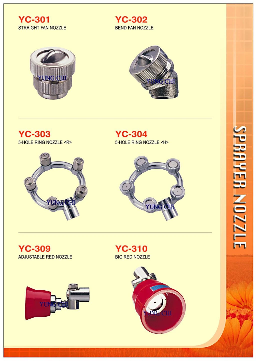 永銡實業股份有限公司 川島牌KAWASHIMA噴頭,噴嘴 用途:清洗.消毒.噴灑農藥 YC-301/一孔扇型直噴嘴 YC-302/一孔扇型彎噴嘴 YC-303/六角五環嘴 YC-304/圓