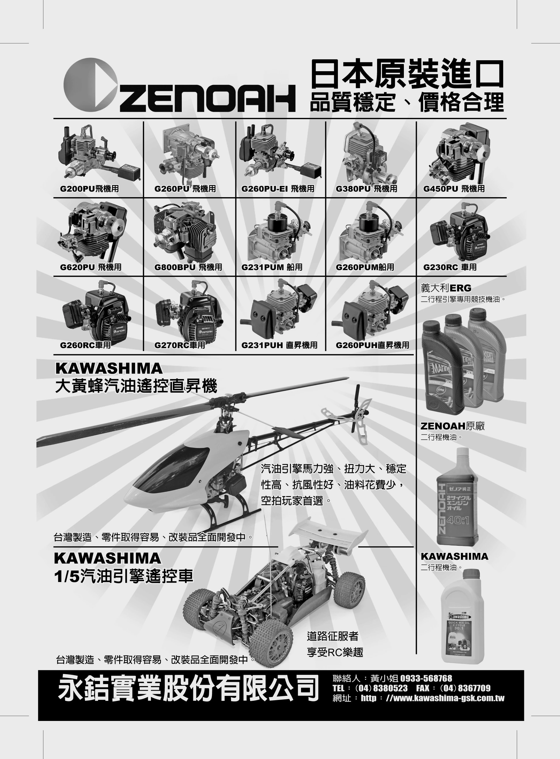 瀏覽次數:495by:永銡川島 遙控技術155期、飛行技術62期廣告 內容: 日本ZENOAH製遙控全系列引擎 義大利ERG二行程機油 日本ZENOAH製二行程機油 川島二行程機油 川島汽油引擎遙控車 川島遙控直昇機 #競技級機油#遙控引擎#遙控技術#遙控直昇機#飛行技術